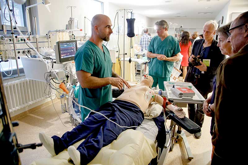 Besonders begehrt waren die Stationsführungen an deren Ende die Stippvisite auf der Intermediate Care Station (IMC) stand – die Überwachungsstation ist eine Vorstufe einer Intensivstation. Auf der IMC präsentierte sich die Anästhesie des Hauses und demonstrierte unter anderem Narkosetiefe-Messungen sowie die Funktion eines Defibrillators.