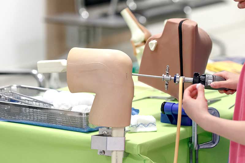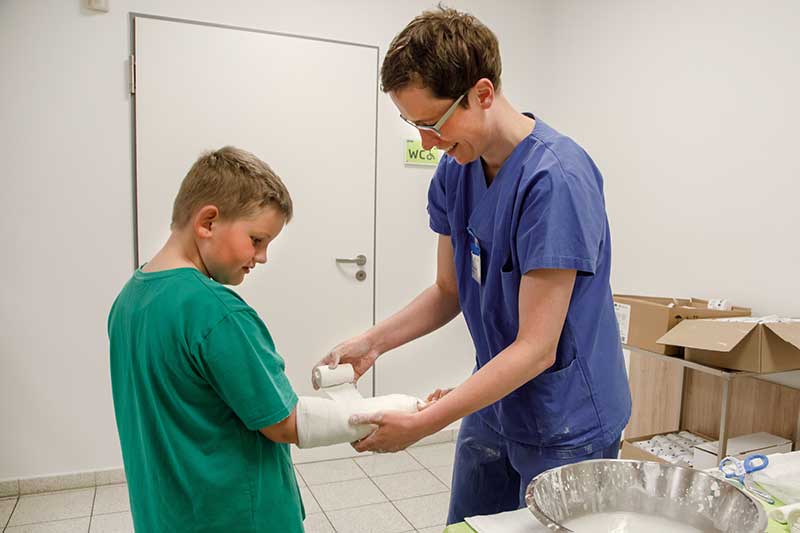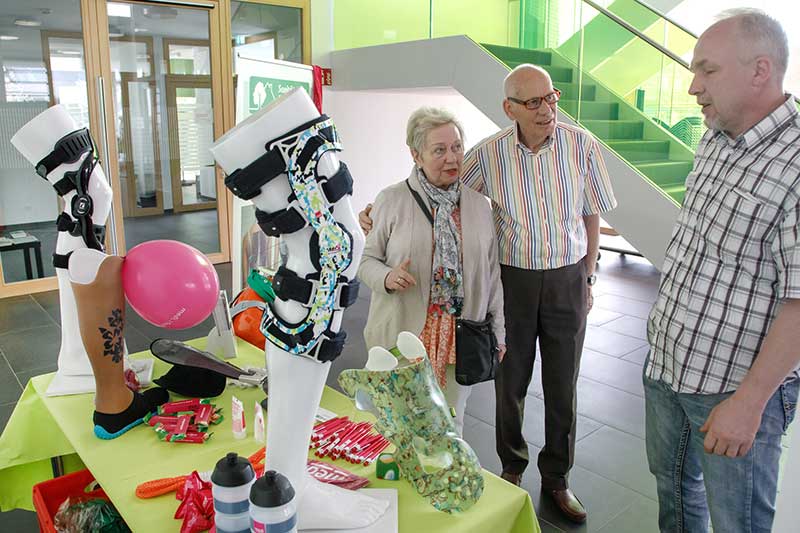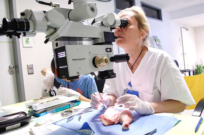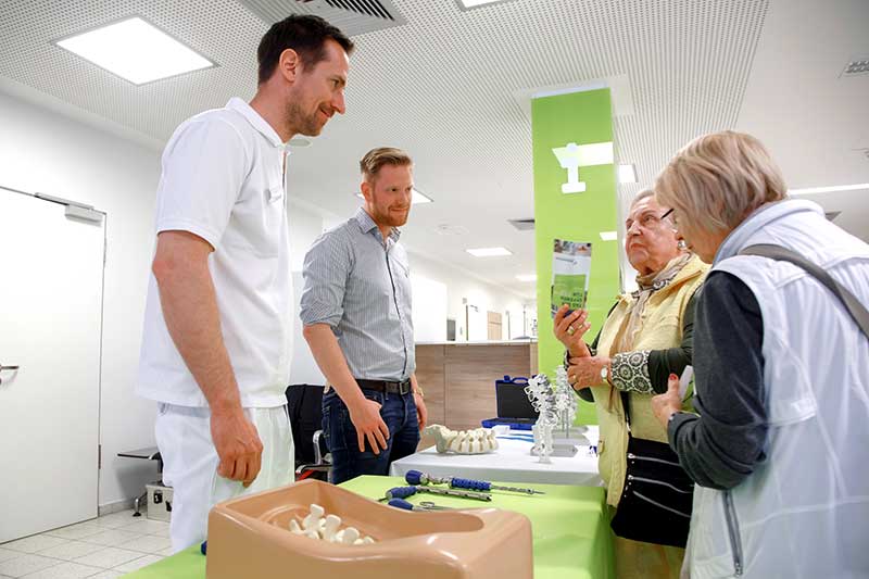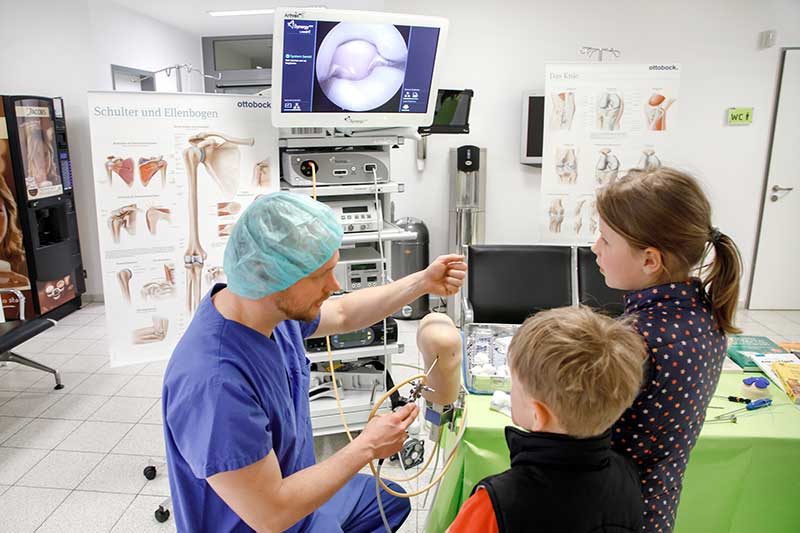 Im Ambulanten Zentrum konnten Besucher an Mitmachstationen zum Beispiel ihre Geschicklichkeit überprüfen und am Arthroskopie-Modell selbst Hand anlegen. Auch beim Operieren eines Hähnchenschenkels mit Mikroskop konnte Fingerfertigkeit unter Beweis gestellt werden. Besonders beliebt bei den jungen Besuchern: die Gipsstation.